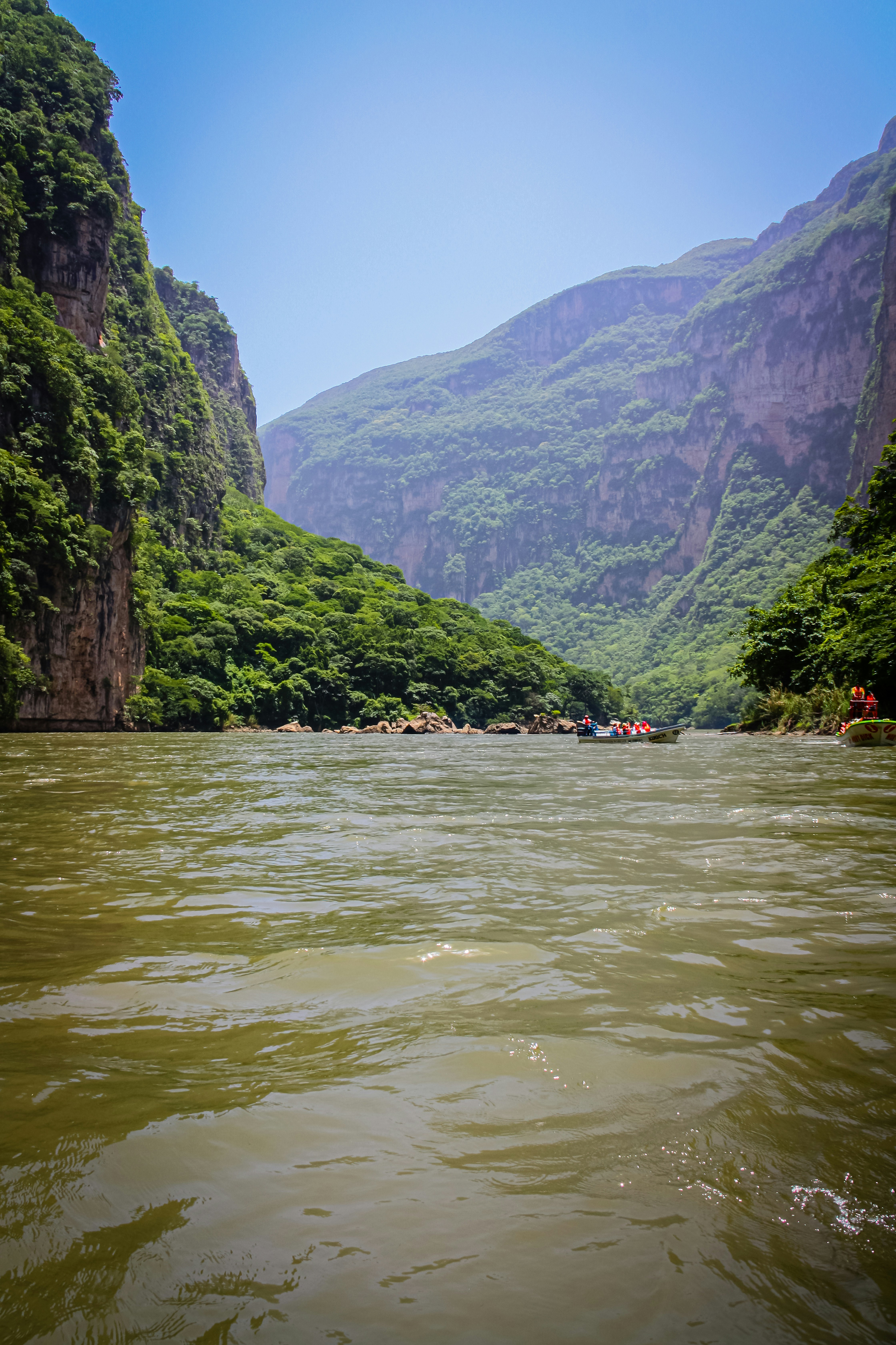 Este es el recorrido clásico. Sales desde uno de los embarcaderos en Chiapa de Corzo y navegas por el cañón hasta la cortina de la presa Chicoasén.